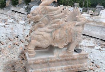 放在門口左側的雄獅一般都雕成麒麟雕塑玩弄繡球或者兩前爪之間方一個繡球張嘴型。門口右側雌獅則雕成左前爪撫摸幼獅或者兩前爪之間臥一幼獅。